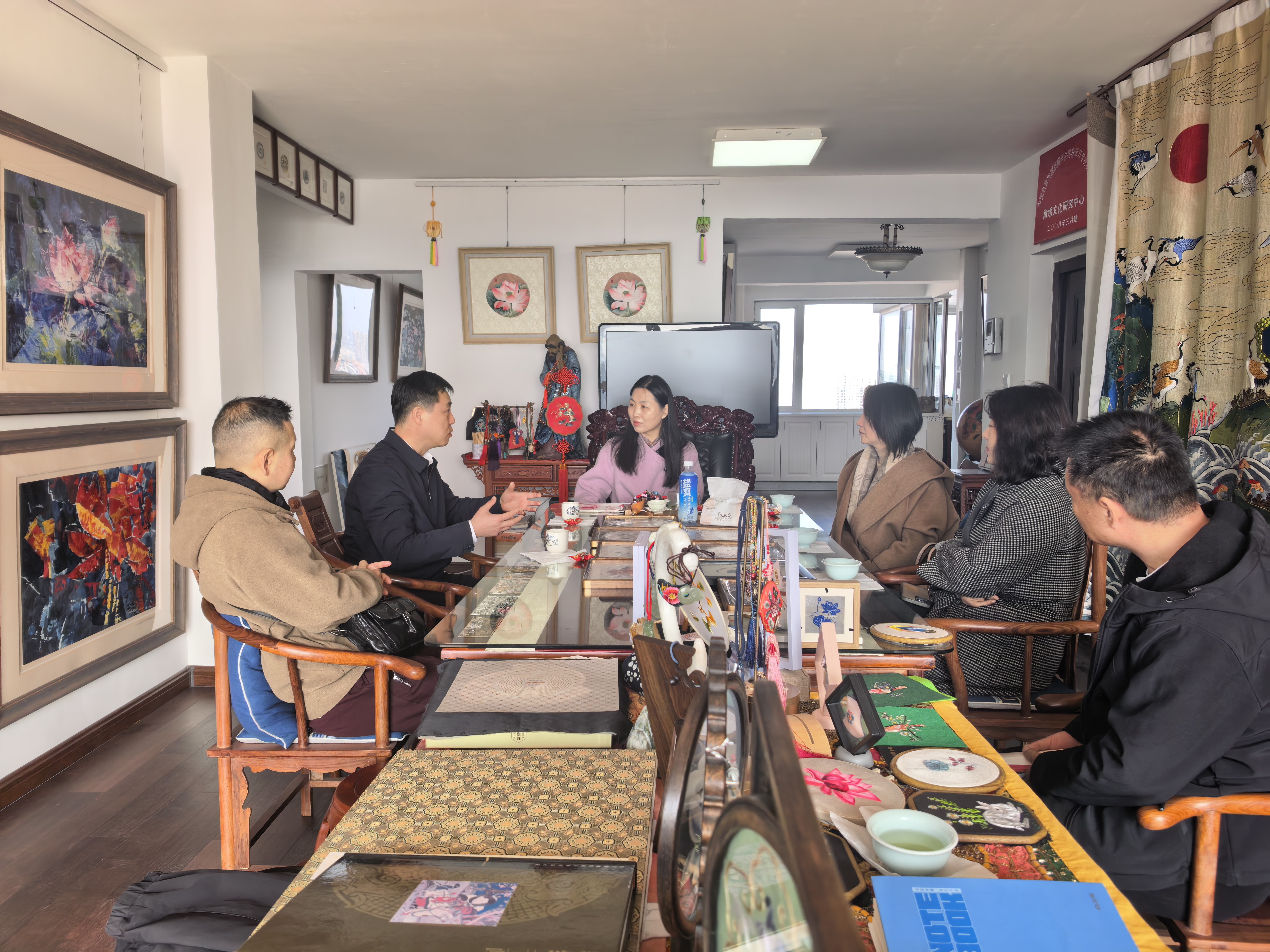 调研组实地考察了毓黹府黹绣艺术博物馆,企业负责人刘军向调研组介绍了毓黹府手工刺绣的历史起源、企业发展、市场运营以及培训中心运营等情况。