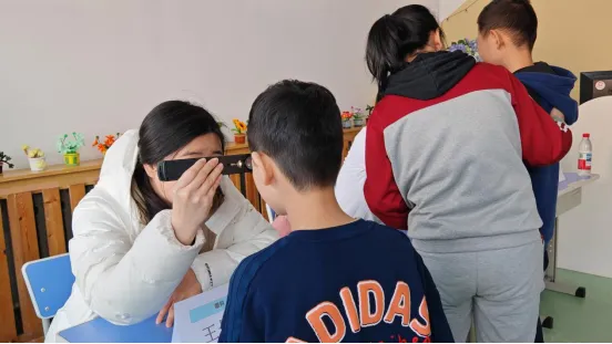 图为医生为孤独症儿童检查视力